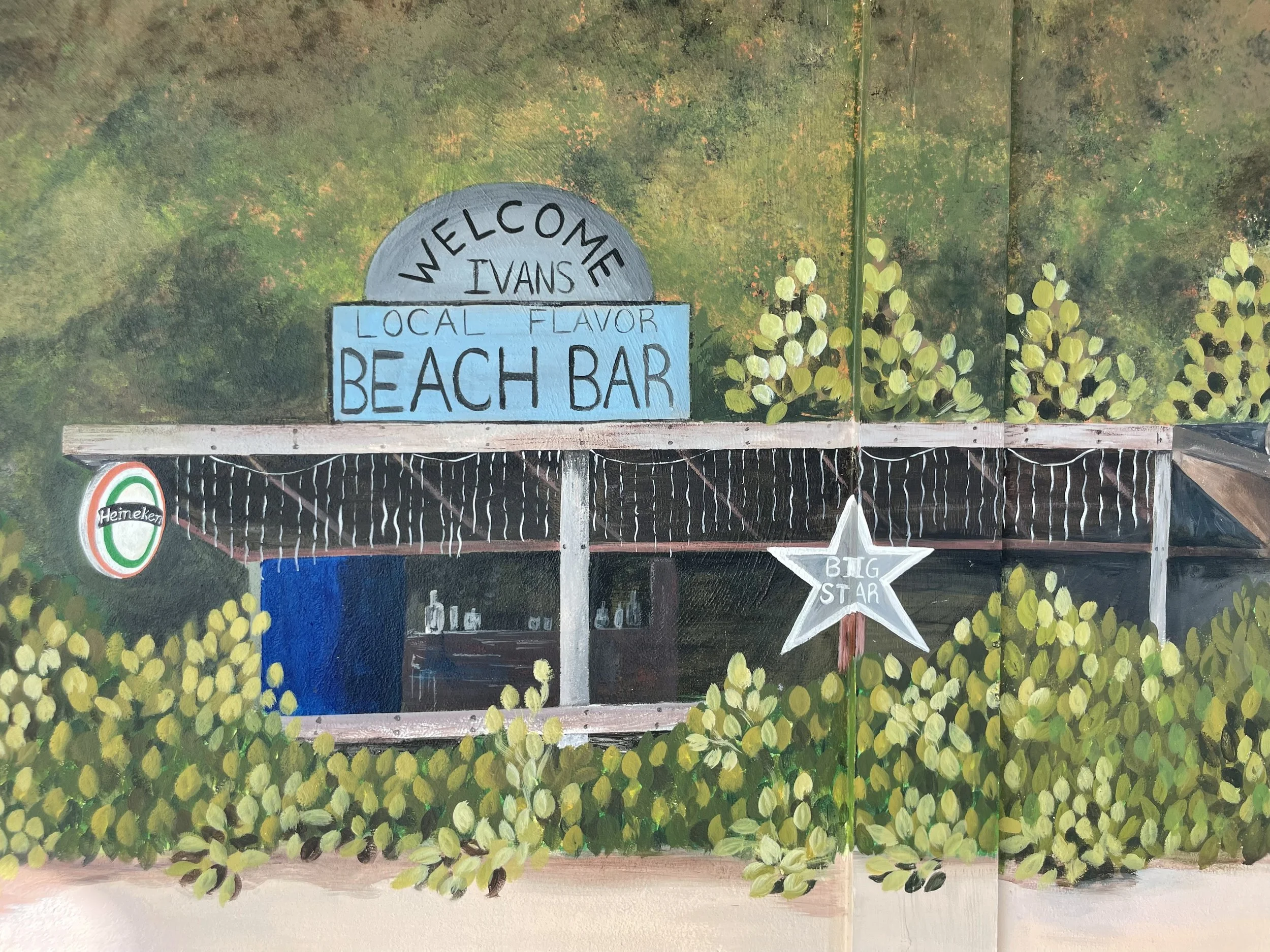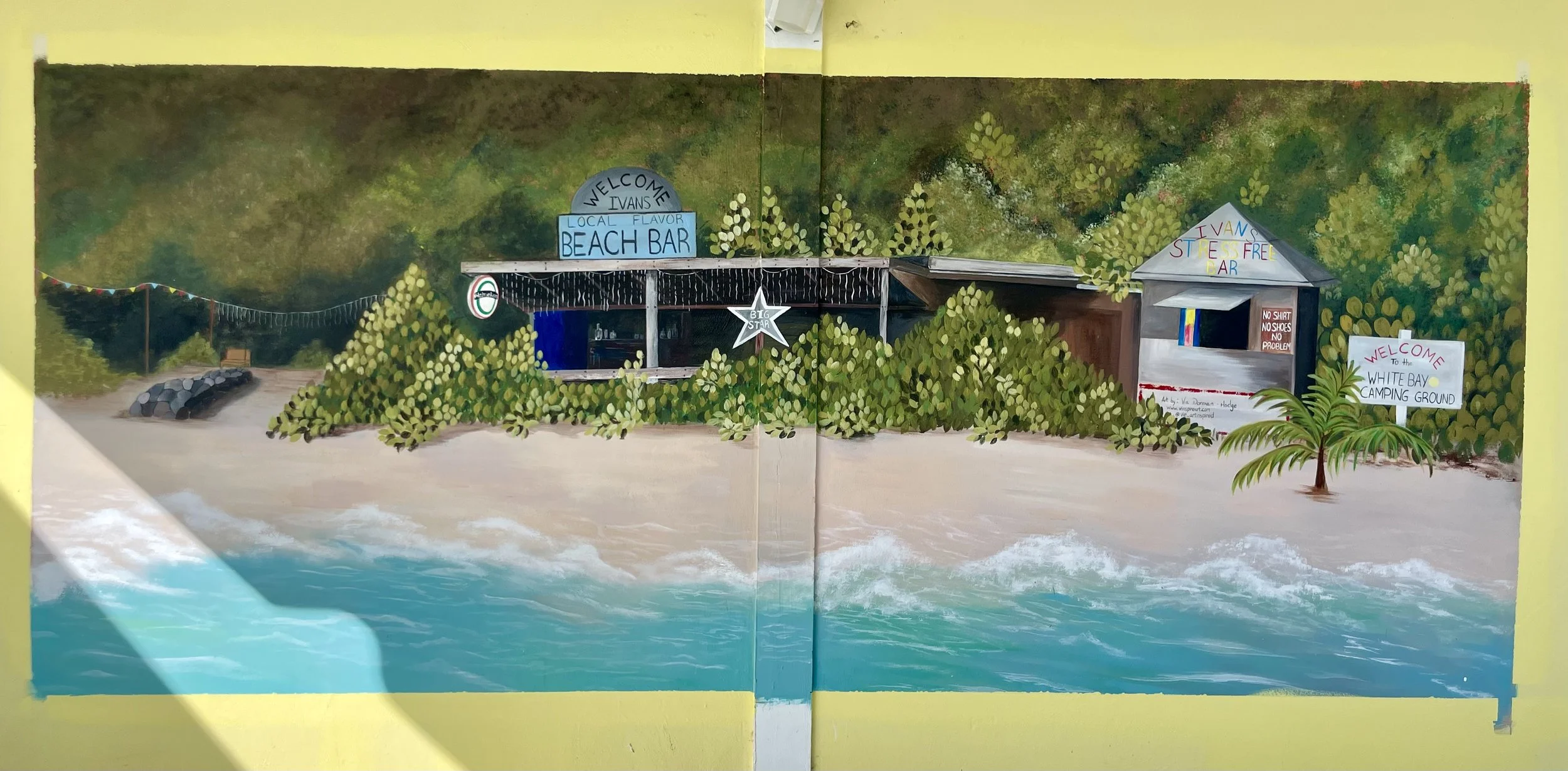 Nestled on a serene beach on Jost Van Dyke, British Virgin Islands, this mural is a time capsule. It captures the essence of a place that has seen many lives over the years, constantly changing and adapting to its environment. This mural is important because it captures a rebirth. Destroyed by hurricane Irma in 2017, Ivan’s was rebuilt in homage of its namesake and this mural painted to honor what has been, and what is to come.